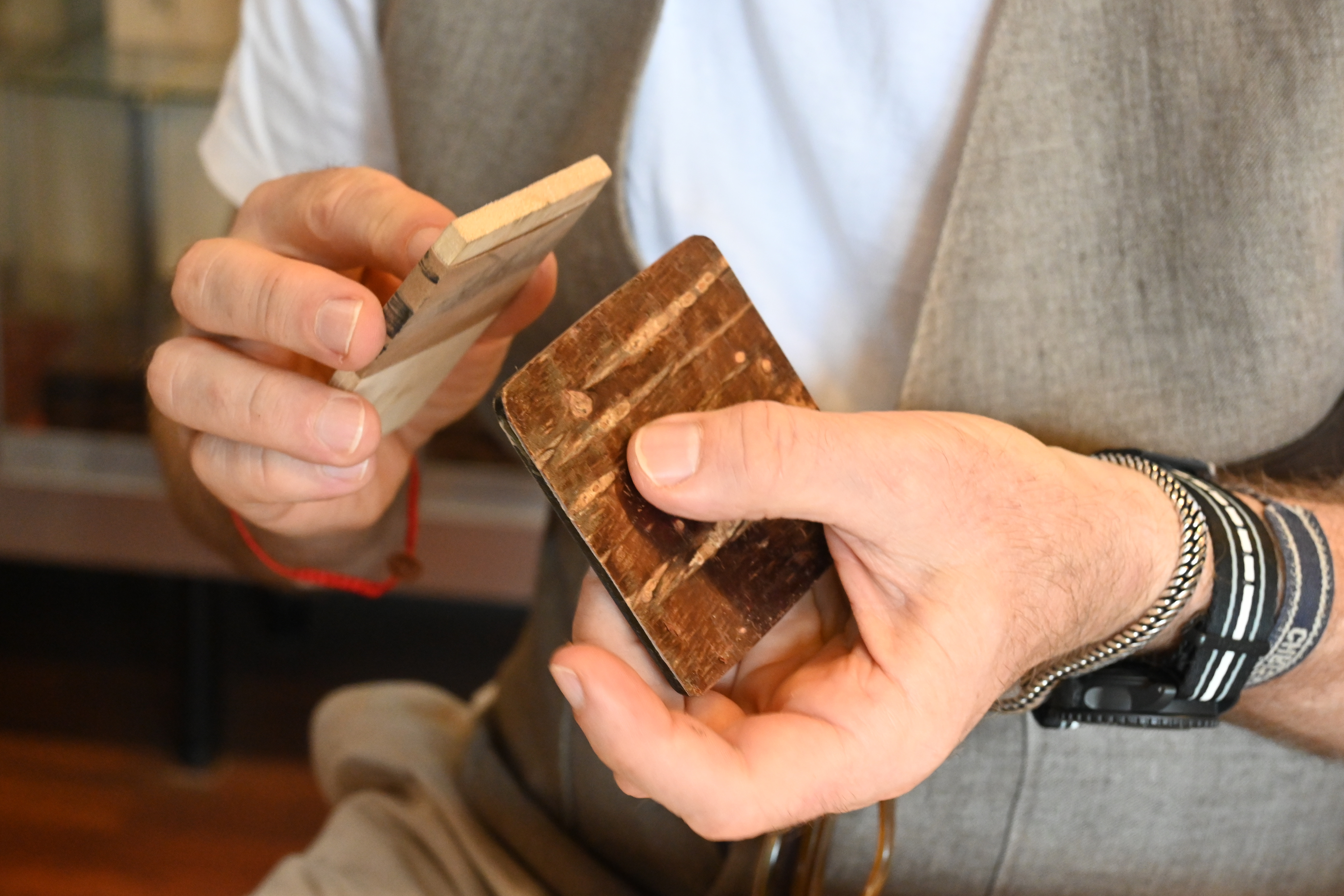乾燥させた山桜の皮の表面を削り、膠をつかって木板に貼り付けコースターやブローチにします。